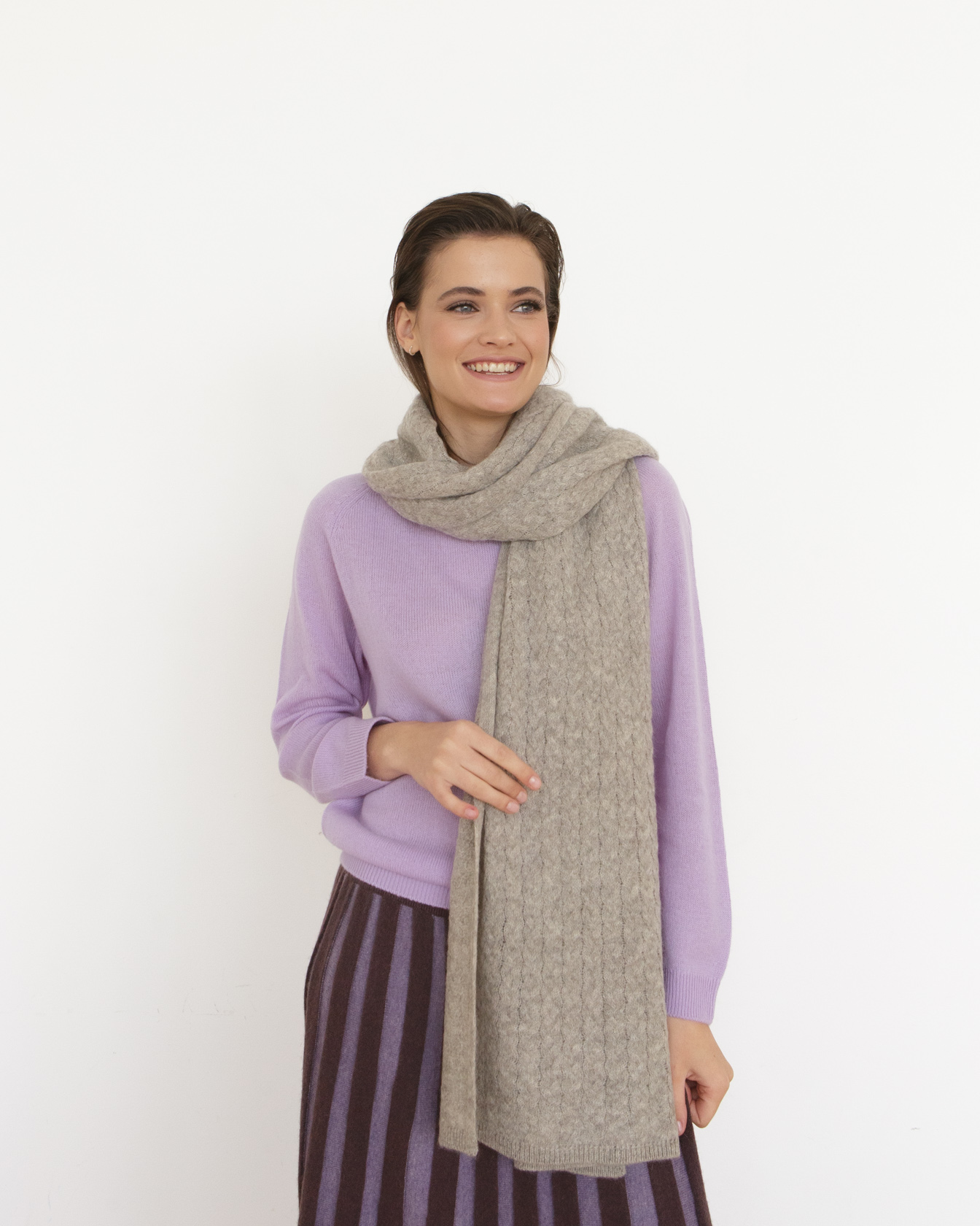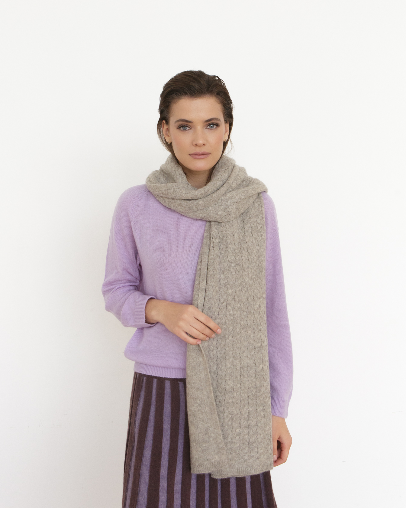 Классическая прямоугольная форма с аккуратной вязкой и мягкой фактурой. Минималистичный дизайн без лишних декоративных элементов подчёркивает натуральность материала и делает аксессуар универсальным. Полотно красиво ложится мягкими складками и сохраняет форму.