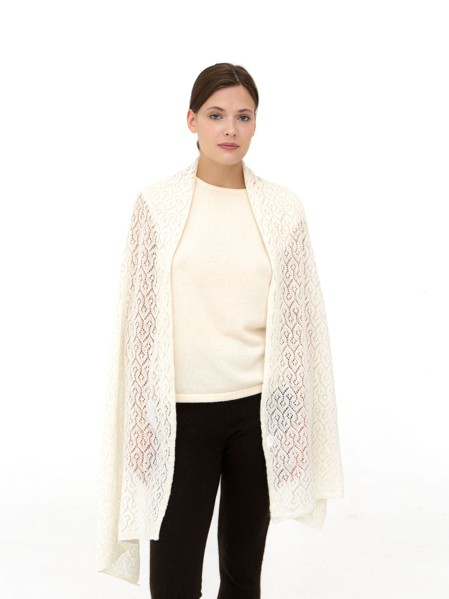 Модель выполнена в свободной форме с выразительной фактурной вязкой, создающей объёмную текстуру. Пластичная структура материала позволяет палантину красиво струиться и формировать мягкие складки.
