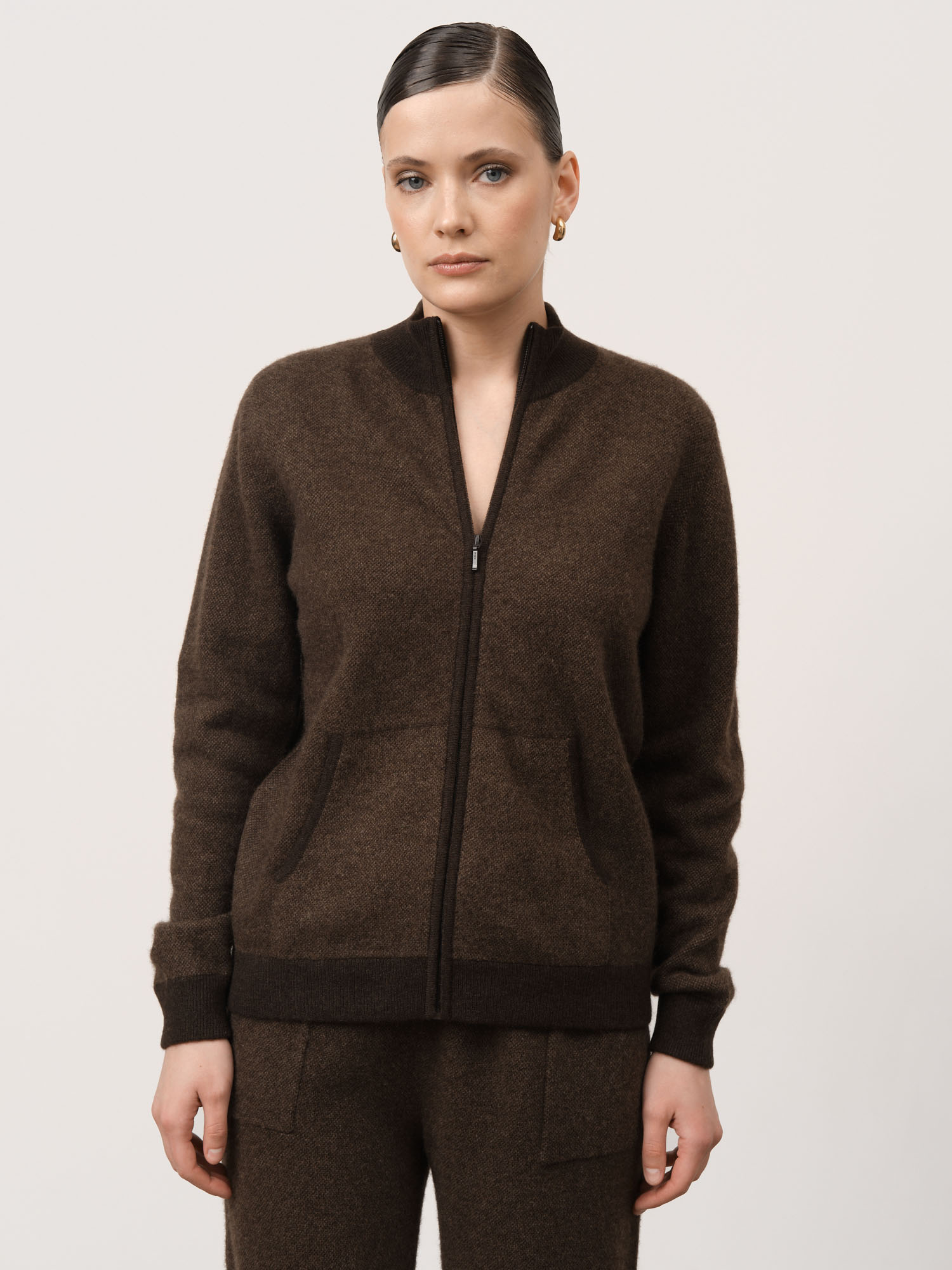 Модель выполнена в формате джемпера на молнии с высоким воротником. Минималистичный крой делает изделие универсальным и удобным для повседневной носки.