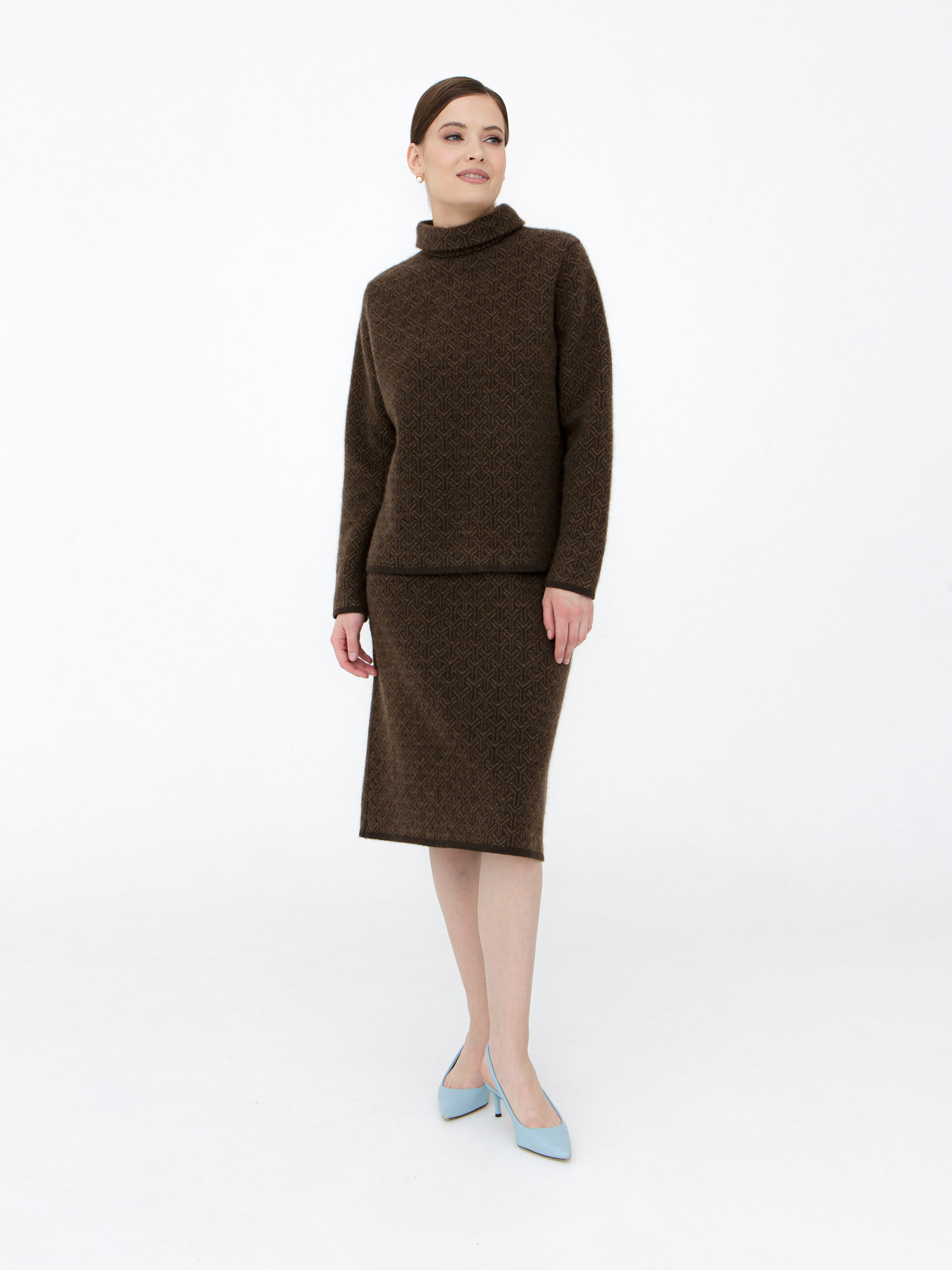 Эта юбка миди из пуха яка — это воплощение утонченной роскоши и непревзойденного комфорта. Изготовленная из натурального пуха яка, эта юбка обладает превосходными теплоизоляционными свойствами, что делает ее идеальным выбором для холодного времени года. Глубокий коричневый оттенок и элегантный узор придают юбке особый шарм, делая ее универсальной для различных образов — от повседневных до деловых. Плотная и одновременно мягкая ткань дарит ощущение уюта, а свободный крой обеспечивает комфорт и свободу движений. Эта юбка станет неотъемлемой частью вашего гардероба, добавляя в него нотку изысканности и тепла.
