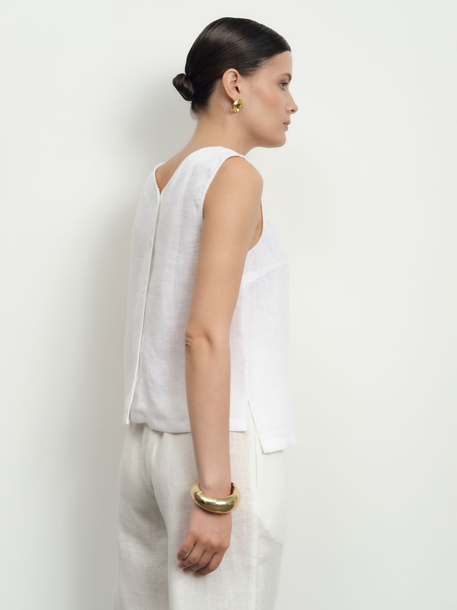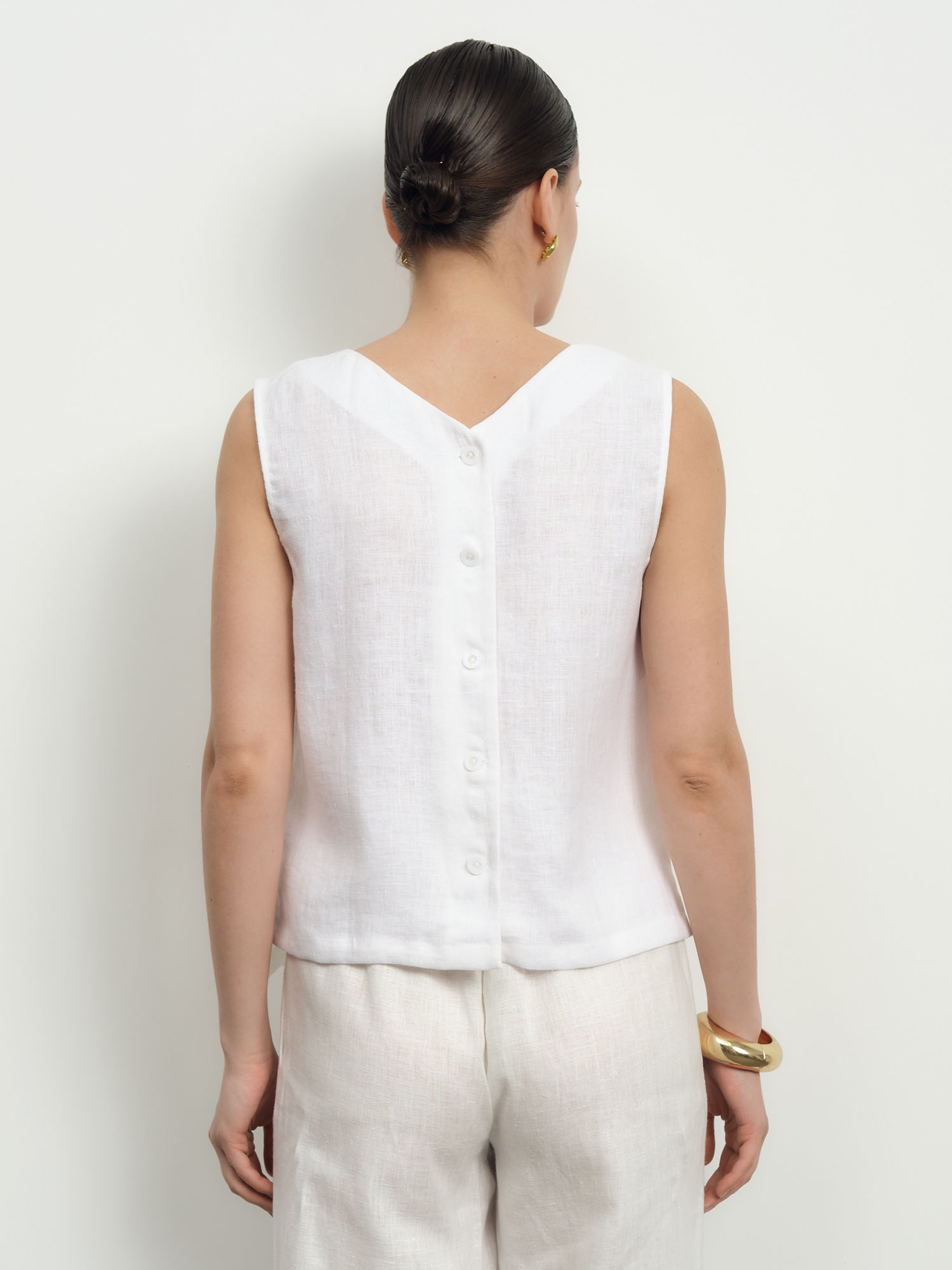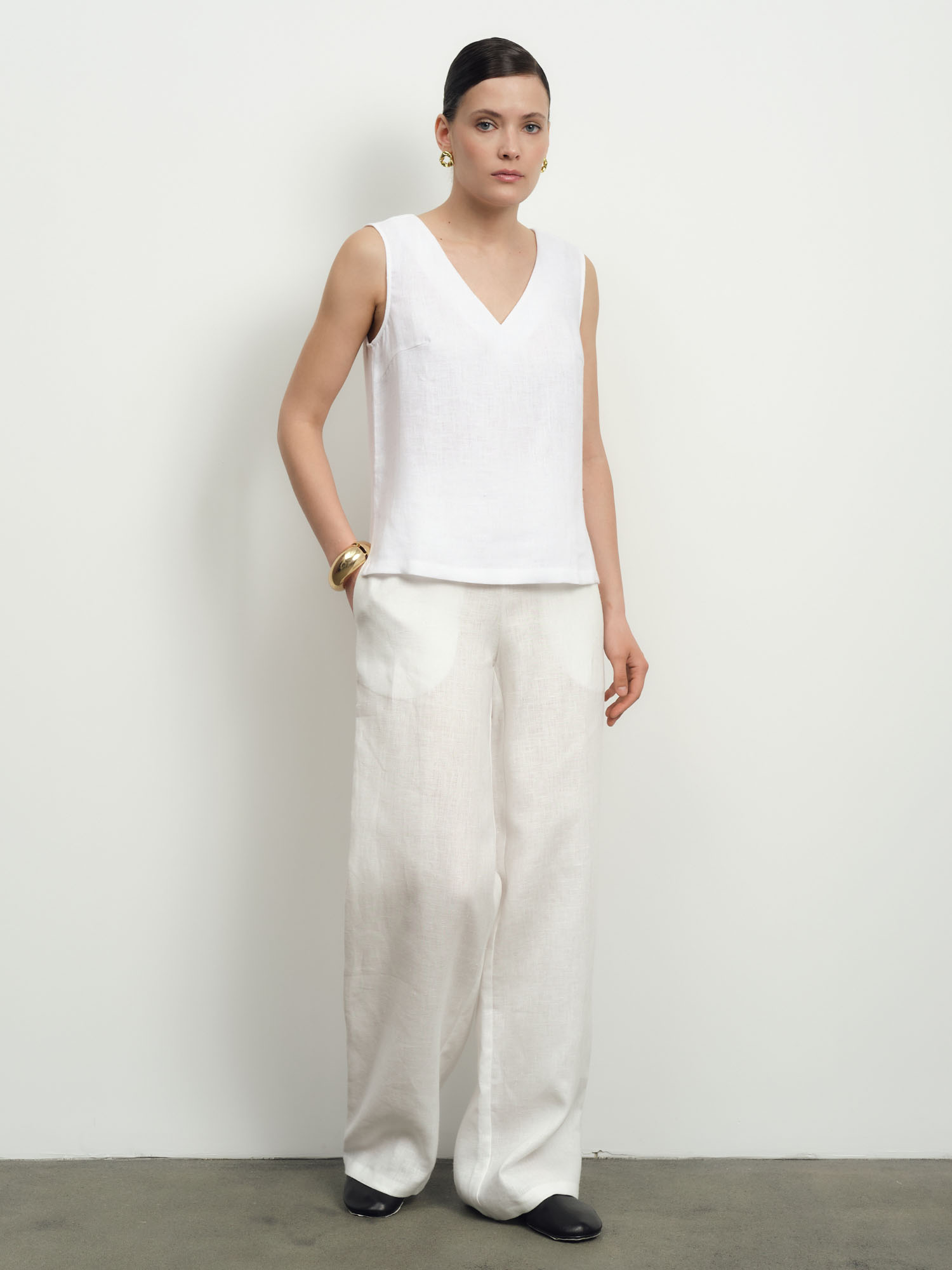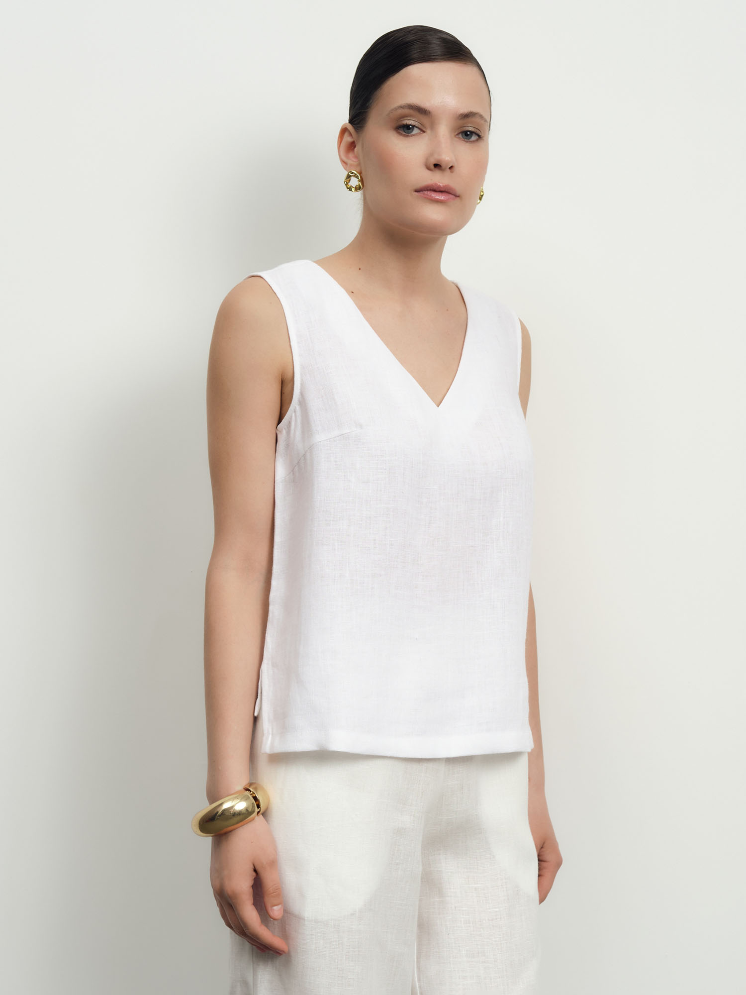 Прямой свободный силуэт без рукавов с аккуратным V-образным вырезом. Лаконичный крой подчеркивает утонченность и современность модели.